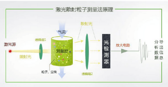 激光光散射粉塵儀通過采氣泵將待測氣溶膠吸入檢測艙,待測氣溶膠在分支處分流成為兩部分,一部分經過一個高效過濾器后被過濾為干凈的空氣,作為保護鞘氣來保護傳感器室的元器件不受待測氣體污染。另一部分氣溶膠,作為待測樣品直接進入傳感器室。 傳感器室中,主要元器件為激光二極管、透鏡組和光電檢測器。檢測時,首先由激光二極管發出的激光,通過透鏡組形成一個薄層面光源。薄層光照射在流經傳感器室的待測氣溶膠時,會產生散射,通過光電探測器來檢測光的散射光強。光電探測器受光照之后產生電信號,正比于氣溶膠的質量濃度。然后乘以電壓校準系數,這個系數通過測定特定濃度的氣溶膠來得到。